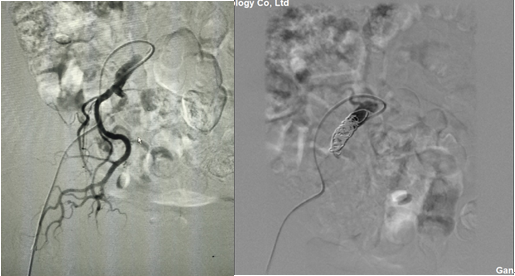 2、為防止支架釋放后,髂外和髂內(nèi)動(dòng)脈匯合處產(chǎn)生內(nèi)瘺,提前將髂內(nèi)動(dòng)脈栓塞。