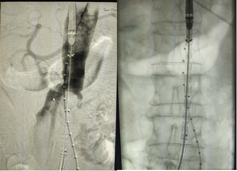 3、建立雙股動(dòng)脈通路;雙側(cè)導(dǎo)管交匯于腹主動(dòng)脈