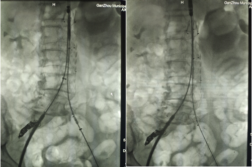 8、調(diào)整好左右兩邊導(dǎo)管導(dǎo)絲,引入左右髂動(dòng)脈分體支架