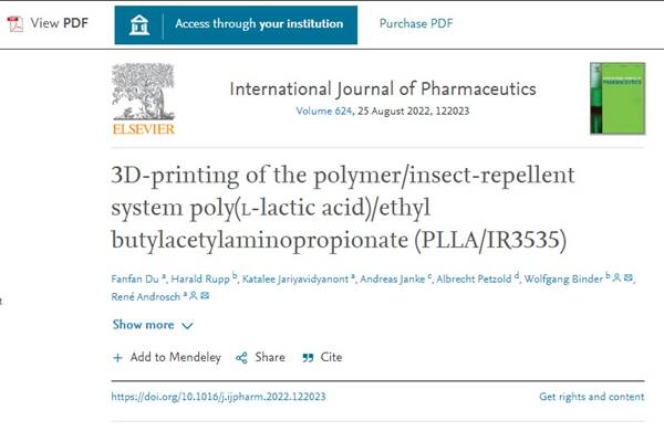△該團(tuán)隊(duì)的研究成果已發(fā)表在《國際藥劑學(xué)雜志》上,題目為“聚合物/驅(qū)蟲系統(tǒng)聚(l-乳酸)/丁基乙酰氨基丙酸乙酯(PLLA/IR3535)的3D打印”(傳送門)