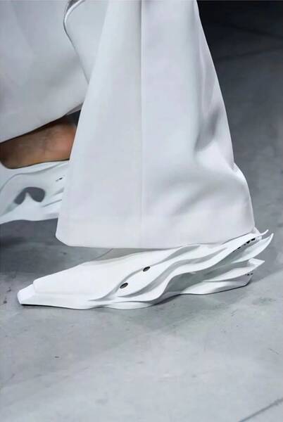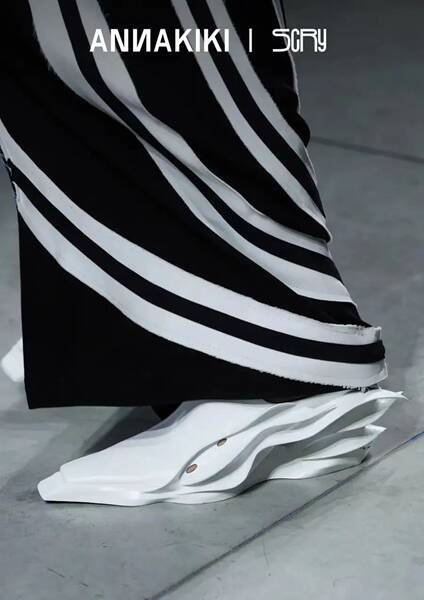 ANNAKIKI 是國(guó)際知名的獨(dú)立設(shè)計(jì)師品牌,擅長(zhǎng)用科技與未來感的設(shè)計(jì)語言去打造獨(dú)一無二的身份標(biāo)簽,也是為數(shù)不多登上米蘭時(shí)裝周官方日程走秀的中國(guó)設(shè)計(jì)師品牌。日前,ANNAKIKI 與前沿創(chuàng)新鞋履品牌SCRY聯(lián)名推出了一款3D打印一體鞋“ETERNAL”,并在2023米蘭時(shí)裝周引起轟動(dòng)。