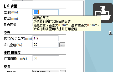如圖此次我們打印的模型參數(shù)層厚由默認(rèn)的0.1修改為0.2(具體參數(shù)修改針對(duì)不同的模型有對(duì)應(yīng)的參數(shù)修改)