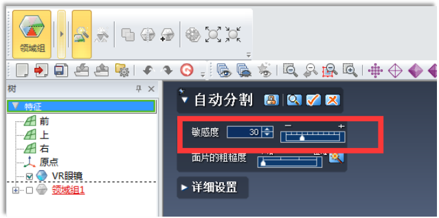 點(diǎn)擊領(lǐng)域組命令后自動(dòng)跳出自動(dòng)分割命令框,需要注意的是敏感度越大,對數(shù)據(jù)表面的采集敏感度越大,所以,對于一些表面物體簡單,沒有復(fù)雜結(jié)構(gòu)的工程數(shù)據(jù)把敏感度控制在20-40左右即可。
