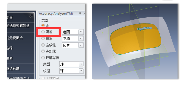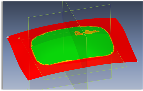 綠色部分表示擬合的片體與導(dǎo)入的工程數(shù)據(jù)的偏差在接受范圍之內(nèi),黃色偏差略大,紅色則是表示完全不擬合