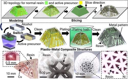 新開發(fā)的多材料數(shù)字光處理 3D 打印機(jī)用于制造包含由標(biāo)準(zhǔn)樹脂或活性前體制成的相互嵌套區(qū)域的部件。對(duì)此類零件進(jìn)行選擇性 3D ELP 加工,可提供具有復(fù)雜中空結(jié)構(gòu)的各種金屬塑料復(fù)合零件,具有特定的拓?fù)潢P(guān)系,分辨率為 40 μm。使用這種技術(shù),傳統(tǒng)方法無(wú)法制造的 3D 設(shè)備成為可能,并且可以在塑料部件內(nèi)部制作金屬圖案,作為電子產(chǎn)品進(jìn)一步小型化的一種手段。所提出的方法還可以生成表現(xiàn)出改性金屬對(duì)基材的附著力的金屬涂層。