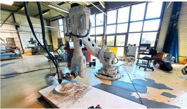 我們的增材制造單元包括一個(gè)擠出機(jī),其中引入了地面材料和一個(gè)安裝在 6 軸 ABB IRB 6700 機(jī)器人上的打印頭,通過(guò)移動(dòng),該機(jī)器人能夠?qū)⒒蚨嗷蛏購(gòu)?fù)雜的虛擬幾何圖形轉(zhuǎn)換為真實(shí)物體,以精確和速度。