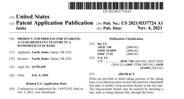 下面以申請人Garth Janke 的發(fā)明為例。Garth Janke申請的發(fā)明題目為“在手持式葉耙中啟用防堵塞功能的產(chǎn)品和工藝”(已發(fā)布為US2021/0337724A1),其中有3個權力要求有助于進一步理解“3D打印”這個過程在專利保護中產(chǎn)生的問題: