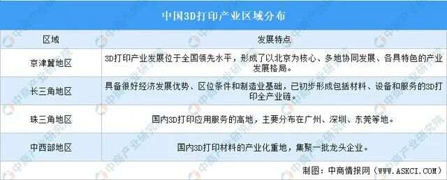 我國3D打印產(chǎn)業(yè)主要分布在京津冀地區(qū)、長三角地區(qū)、珠三角地區(qū)、中西部地區(qū)。