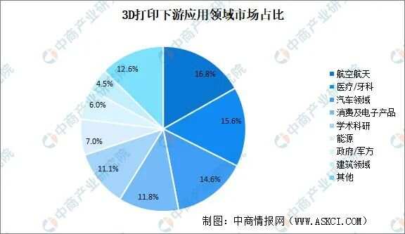 3D打印目前已被廣泛應用于航空航天、汽車、醫(yī)療等領(lǐng)域,并逐漸被嘗試應用于更多的領(lǐng)域中。根據(jù)Wohlers Report 2022報告顯示,2021年3D打印主要應用于航空航天、汽車、消費及電子產(chǎn)品、醫(yī)療/牙科、學術(shù)科研等領(lǐng)域,占比情況如下: