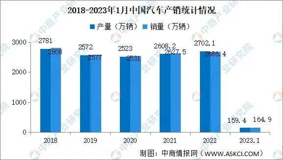 2023年1月,全國汽車產(chǎn)銷分別完成159.4萬輛和164.9萬輛,同比分別下降34.3%和35%。