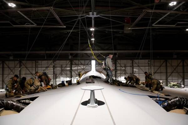 △第60和第349維修中隊(duì)的飛行員正在為C-5M超級(jí)銀河進(jìn)行維修前的準(zhǔn)備工作,包括機(jī)翼表面的維護(hù)。這架C-5M超級(jí)銀河裝備了新打印的3D部件,其中包括被稱(chēng)為“塊”和“楔子”的部件