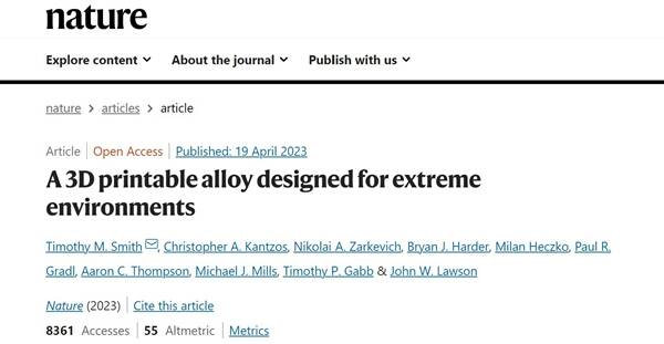 Smith 和他的 Glenn 同事 Christopher Kantzos 共同發(fā)明了 GRX-810型高溫合金。這項研究結(jié)果被發(fā)表在《Nature》雜志上發(fā)表的一篇同行評審論文中,論文題目為“A 3D printable alloy designed for extreme environments”。來自格倫、美國宇航局位于加利福尼亞硅谷的艾姆斯研究中心、美國宇航局位于阿拉巴馬州亨茨維爾的馬歇爾太空飛行中心和俄亥俄州立大學(xué)的參與者團(tuán)隊共同撰寫了這篇論文。