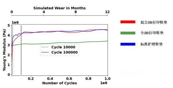 在耐久性和抗壓剛度測試中,混合3D打印鞋墊樣品與標(biāo)準護理鞋墊樣品的耐久性曲線非常接近,而全3D打印鞋墊樣品在100萬次循環(huán)過程中顯示出較低的剛度增長(3)