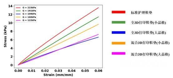 該研究表明,兩種使用3D打印工藝制作的鞋墊至少與標(biāo)準護理鞋墊一樣耐用,而且全3D打印的鞋墊在重復(fù)載荷的作用下有更低的剛度增長,表明其具有更高的耐用性能。因此,從患者的角度來看,鞋墊的舒適度可能與標(biāo)準護理鞋墊相當(dāng)或超過標(biāo)準護理鞋墊。3D打印鞋墊制作方法和材料選擇表明,其具有更低的剪切剛度,這可以減少佩戴者足底組織上的剪切應(yīng)力。并且通過控制鞋墊內(nèi)部晶格大小可以實現(xiàn)區(qū)域控制抗剪剛度和抗壓剛度的能力,以滿足患者的特定需求。