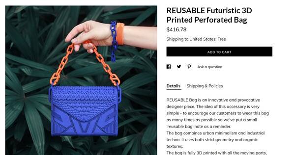 Malinko Design 使用3D打印制造了一款手提包,被稱為“可重復(fù)使用的袋子”,顛覆了時(shí)尚圈的同時(shí)也使得時(shí)尚領(lǐng)域更具環(huán)保意識(shí)。與傳統(tǒng)的皮革或 PU 純素皮革制成的手提包不同,可重復(fù)使用的包采用尼龍3D打印。選擇尼龍材料是因?yàn)?,與其他常用的材料相比,尼龍更耐磨損,如果發(fā)生任何磨損,只需再進(jìn)行一點(diǎn)3D 打印或加熱即可輕松修復(fù)!