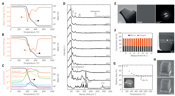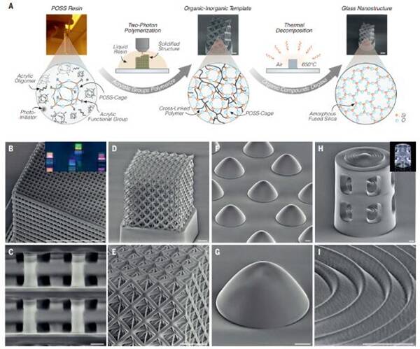 近期,加利福尼亞州立大學(xué)的J. Bauer團(tuán)隊(duì)提出了一種無需燒結(jié),低溫實(shí)現(xiàn)3D打印硅玻璃的技術(shù),可以實(shí)現(xiàn)復(fù)雜的透明熔融石英玻璃納米結(jié)構(gòu)的制造。該技術(shù)主要采用丙烯酸酯功能化的多面體低聚硅氧烷(POSS)樹脂進(jìn)行自由形態(tài)熔融二氧化硅納米結(jié)構(gòu)的無燒結(jié)、雙光子聚合,以實(shí)現(xiàn)納米結(jié)構(gòu)的打印。與上文提到了通過犧牲性粘合劑不同,這種POSS樹脂本身構(gòu)成了一個(gè)連續(xù)的硅氧分子網(wǎng)絡(luò),僅在650℃時(shí)就能形成透明的熔融石英。這個(gè)溫度比將離散的二氧化硅顆粒熔化成連續(xù)體的燒結(jié)溫度低500°C。該工作以題為“A sinterless, low-temperature route to 3D print nanoscale optical-grade glass”的文章發(fā)表于Science上。