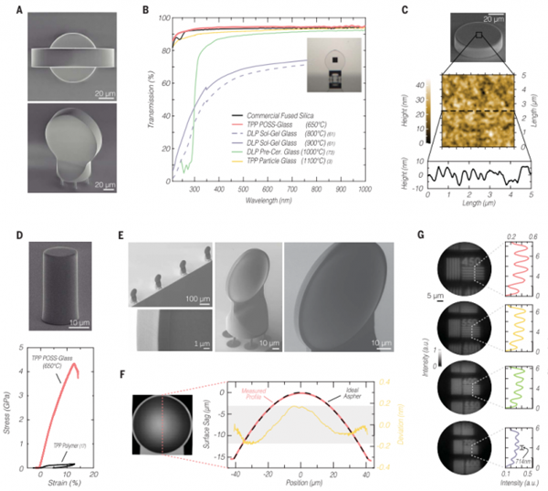 該文研究團(tuán)隊(duì)通過設(shè)計(jì)3D打印程序,利用該材料制造出具有優(yōu)良光學(xué)性能的自由形狀的熔融石英玻璃微光學(xué)元件,用于成像和光束整形的透鏡系統(tǒng)中。用TPP打印了具有非球面輪廓的平面凸起的熔融石英微透鏡,該透鏡經(jīng)過數(shù)值優(yōu)化以校正球面像差。最終的POSS-玻璃透鏡,基底直徑為82微米,矢狀(sag)高度為15微米,在650℃下處理,具有原始的結(jié)構(gòu)質(zhì)量,具有精細(xì)的納米級輪廓和光滑的表面。光學(xué)輪廓測量確認(rèn)其卓越的形狀精度,相對于非球面設(shè)計(jì),鏡片輪廓的峰谷偏差為±175納米。測量的有效值粗糙度為8.1納米,這意味著有效值與下垂比為0.05%。隨后,用1951年美國空軍型分辨率目標(biāo)進(jìn)行的光學(xué)分辨率測量證明了微透鏡的出色成像性能。
