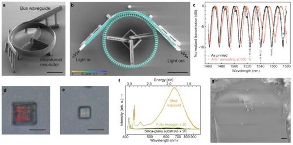 該方法包括三個(gè)主要步驟。首先,將HSQ溶解在有機(jī)溶劑中,并滴在基材上。一旦HSQ干燥,使用聚焦的亞皮秒激光束將所需的3D形狀繪制出來(lái)。最后,使用氫氧化鉀溶液溶解未暴露的HSQ。拉曼光譜顯示打印微結(jié)構(gòu)具有石英玻璃的特征,但仍存在殘留的氫和碳痕跡。為了去除這些有機(jī)物的殘留并獲得更純凈的石英玻璃,可以通過(guò)在較低溫度下(約900°C)對(duì)結(jié)構(gòu)進(jìn)行退火的額外步驟。此后,結(jié)構(gòu)的光譜與商業(yè)熔融石英玻璃基板的光譜相匹配。