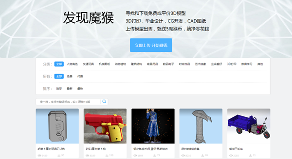 魔猴網(wǎng)3D模型庫(kù)是一個(gè)綜合性的3D模型網(wǎng)站,只要輸入關(guān)鍵詞即可找到自己需要的模型。同時(shí),魔猴網(wǎng)模型庫(kù)也支持大家自行上傳自己原創(chuàng)模型,并獲取收益。