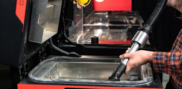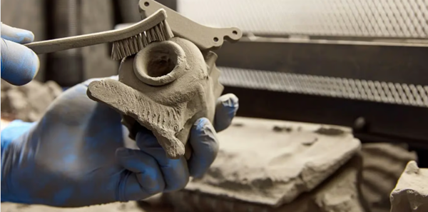 打印過(guò)程結(jié)束后,還需要進(jìn)行大量的后處理工作。一旦構(gòu)建室冷卻下來(lái)(可能需要幾個(gè)小時(shí)),您就會(huì)發(fā)現(xiàn)固體3D打印部件被包裹在未燒結(jié)的松散粉末床中。要取出部件,您需要將構(gòu)建室?guī)У揭粋€(gè)除粉站。使用刷子、壓縮空氣鼓風(fēng)機(jī)或其他形式的噴射技術(shù),將松散粉末清除并收集起來(lái),以備下次打印使用。附加的除粉裝置可以減少混亂,但自然也會(huì)增加SLS投資的總成本。