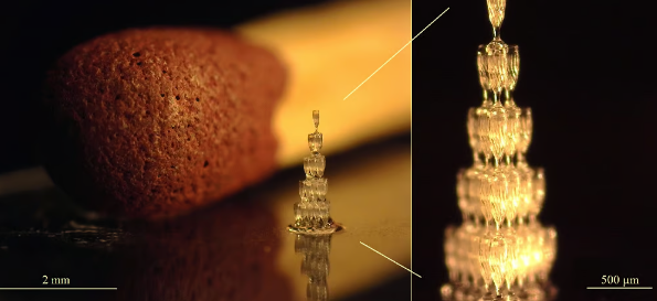 這座塔中的每個(gè)香檳槽高400微米,由Microlight3D用TPP打?。▉?lái)源:Microlight3D)