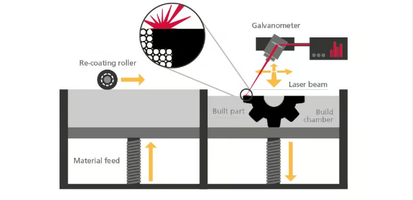 接下來,重涂刀片在構(gòu)建平臺上涂上一層薄薄的粉末。然后,激光(或多個激光)掃描下一層的輪廓并燒結(jié)粉末顆粒。一旦完成一層,構(gòu)建平臺就會向下移動,刀片會在表面上重新涂上一層干凈的粉末。重復(fù)這個過程,直到一個或多個零件完成,同時仍然包裹在粉末中。