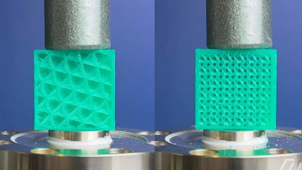 評估具有各種填充圖案的零件的壓縮強度(來源:Slant 3D via YouTube)
