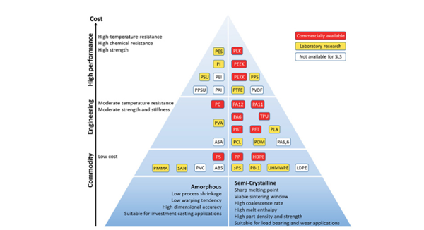 盡管來源有很大不同,但HPP的特性和性能與金屬相似。首先,需要注意的是,“高性能”一詞并不是一個技術(shù)術(shù)語。相反,它指的是工程級工程聚合物,往往具有更高的強度、純度、剛性以及耐磨性和耐化學(xué)性。在這些聚合物中,我們可以引用熱塑性塑料,例如ULTEM、PEKK、PEEK等。盡管TPE/TPU、PC和尼龍有時被歸為一類,但它們應(yīng)被視為“工程熱塑性塑料”。這些工程材料可能足以滿足某些應(yīng)用的要求并且價格較低,盡管它們的性能不如金屬或HPP。用戶在選擇以下材料時應(yīng)該考慮自己到底需要什么。