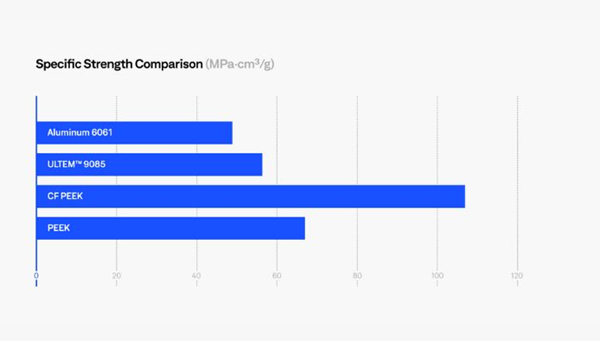 例如,PAEK材料以其優(yōu)異的耐化學(xué)品、耐液體、耐磨損、耐高溫和耐火性而聞名。此外,即使在高溫或零度以下的溫度下,它們也具有卓越的熱性能和機(jī)械性能以及高抗沖擊性。使用高性能聚合物的主要優(yōu)點之一是其極高的強度重量比(甚至比鋁更好,因為它們大約輕60-70%),從而可以制造非常耐用但重量輕的零件。玻璃化轉(zhuǎn)變溫度也往往很高,斷裂伸長率也很高,盡管PEI、PEKK和PEEK之間存在差異。