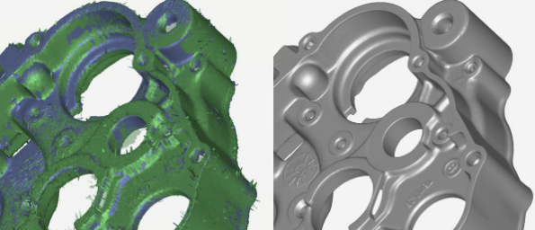 軟件使用算法來“解釋”點數(shù)據(jù),在許多情況下,填補掃描儀未捕獲足夠物體數(shù)據(jù)的空白,例如當表面太亮并干擾掃描儀光線時。這就是軟件供應商吹噓其屬性算法和其他“智能”功能的強大之處,這些功能旨在修復點云數(shù)據(jù)中的任何異常??纯聪旅娴膾呙钄?shù)據(jù)圖和使用3D掃描儀制造商Artec 3D的Artec Studio軟件處理的“清理”模型。