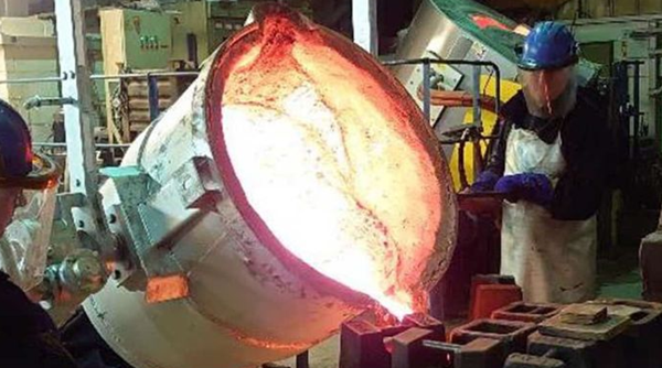 在砂型鑄造過程中,液體材料(通常是金屬)被倒入砂罐中(照片來源:BigRep)