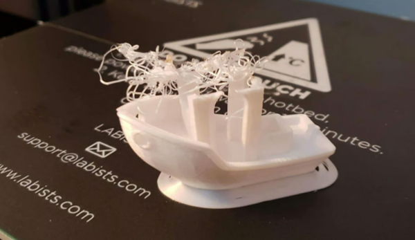 翹曲  ABS 和許多其他長絲一樣,容易出現(xiàn)翹曲問題。減少翹曲的一種方法是使用加熱床,并在加熱床上鋪上一層丙酮和 ABS 長絲碎片。但即便如此,也可能發(fā)生翹曲。在 3D 模型中添加木筏可以完全消除翹曲問題。