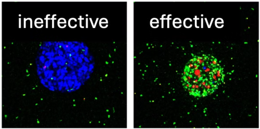 △添加了非活性(左)和活性(右)抗體的腫瘤。綠色表示 T 細(xì)胞聚集,紅色表示腫瘤被殺死。圖片來源:Liao 等人(2024 年)