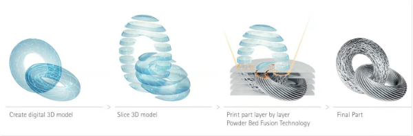 4:3D金屬燒結(jié)工藝始于數(shù)字文件,然后由于它是一個逐層工藝,因此可以創(chuàng)建其他金屬制造工藝無法實現(xiàn)的形狀和整體組件(來源:EOS)