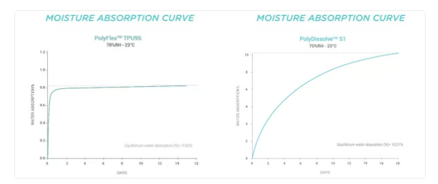 5:長絲制造商PolyMaker為每種材料提供了吸濕曲線圖,標明了材料暴露在潮濕環(huán)境中多長時間才會出現(xiàn)問題(來源:PolyMaker)