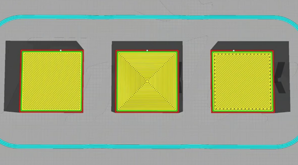 5:初始層圖案(從左到右):直線、同心、之字形(來源:Myles Vendel通過All3DP;模型:ItsMaxify通過Printables)