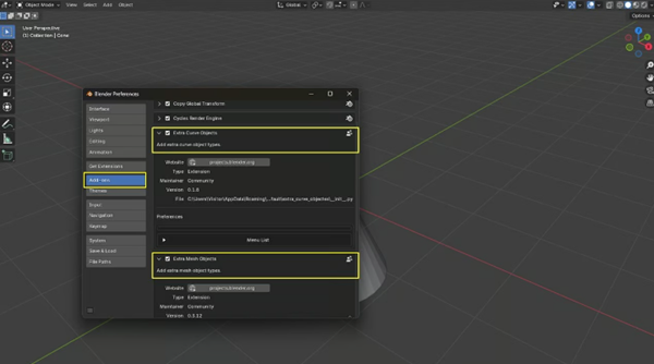 或者,如果您的Blender版本從4.1開始,則無需執(zhí)行這些步驟,因為附加組件現(xiàn)在是設置的一部分。不過,您必須通過轉(zhuǎn)到“編輯>首選項>附加組件”,然后選中“添加曲線:額外對象”和“添加網(wǎng)格:額外對象”來啟用它們。