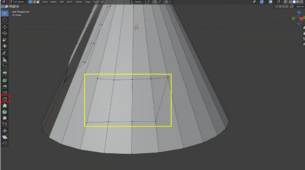 1、刀具工具:在“編輯”模式下,這將允許以受控方式添加頂點,根據(jù)刀具移動的路徑(黃色)。請注意,它會引入一些邊緣。上圖顯示了在邊緣旁邊添加的頂點,表示放置刀具工具(紅色)的部分。