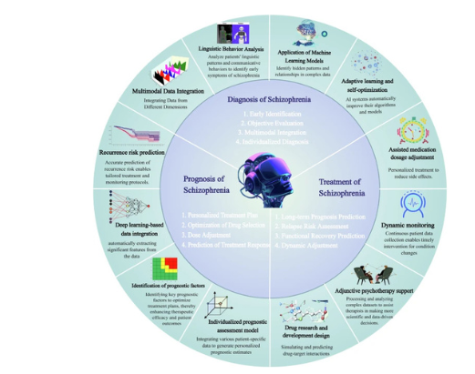 該圖說明了人工智能在精神分裂癥的診斷、治療和預(yù)后中的應(yīng)用。