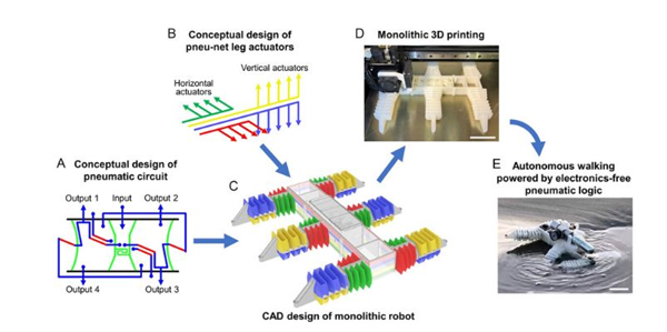 通常,3D打印機器人采用流體控制電路,即充氣電路,但這需要復(fù)雜的程序和材料。此外,還必須手動組裝各種組件。這使得該過程難以重現(xiàn),非專業(yè)人士無法接觸。能夠移動的機器人也能面對崎嶇的地形,因為它們被編程為具有重復(fù)且精確協(xié)調(diào)的動作。這些因素會中斷機器人的運動并很快導(dǎo)致行走機器人跌倒。
