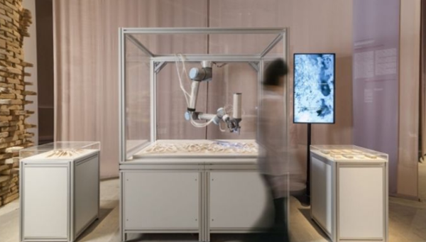 展覽“地質(zhì)微生物構(gòu)造”探索生物水泥化作為一種將建筑垃圾轉(zhuǎn)化為新型建筑材料的策略。該方案由蘇黎世聯(lián)邦理工學(xué)院和洛桑聯(lián)邦理工學(xué)院的研究人員開(kāi)發(fā),融合了生物技術(shù)、機(jī)器人制造和建筑技術(shù)。在裝置的中心,機(jī)械臂不斷將沙子、微生物培養(yǎng)物和礦物溶液分層堆積。一旦整合,就會(huì)觸發(fā)反應(yīng),將這些材料固化成類似石頭的形狀。該項(xiàng)目由此提出了可持續(xù)建筑生產(chǎn)的全新形式。