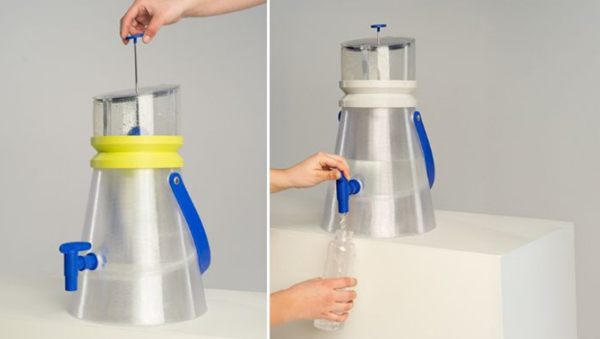 最后,打開球閥讓水流出。之后,水龍頭即可快速便捷地使用。該裝置每天可產(chǎn)水6升。它配有手柄,方便攜帶。我們的目標(biāo)是擴(kuò)大該解決方案的規(guī)模,以滿足更大的需求,例如為整個(gè)社區(qū)提供飲用水。
