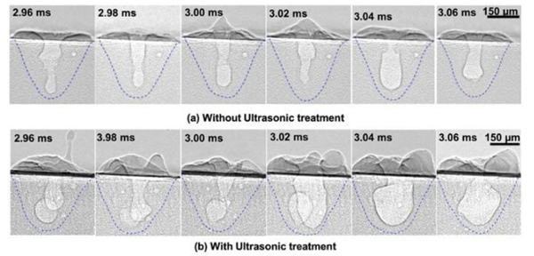 經(jīng)過和未經(jīng)過超聲波處理的3D打印部件的熔池動(dòng)力學(xué)和凝固的X射線圖像:可見的管狀氣孔是3D打印金屬部件中最常見的缺陷之一。