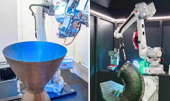 機械臂也用于定向能量沉積3D打?。ㄗ髨D來自Additec)和電弧增材制造(右圖來自MX3D)。