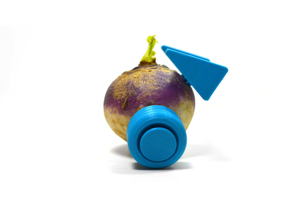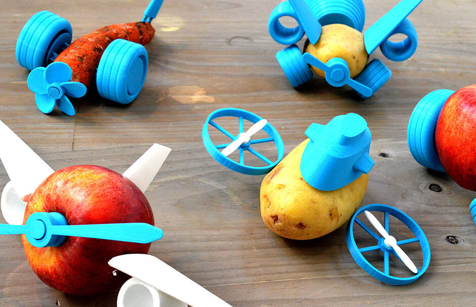 法國一位名叫Bernier的設(shè)計師為小朋友們發(fā)起了一個Open Toys項目,他通過3D打印機把蔬菜組裝成各種有趣的樣子,例如潛水艇、賽車、直升飛機等等等等,配件包括輪子、機翼、螺旋槳以及駕駛艙,小朋友們可以將其與蔬菜隨心搭配,創(chuàng)造出各種自己想要的玩具。然后有一天你就會發(fā)現(xiàn),家里陸續(xù)出現(xiàn)了什么茄子飛機、土豆賽車、胡蘿卜潛水艇等等“不明生物”,而這些都來自你家孩子之手。