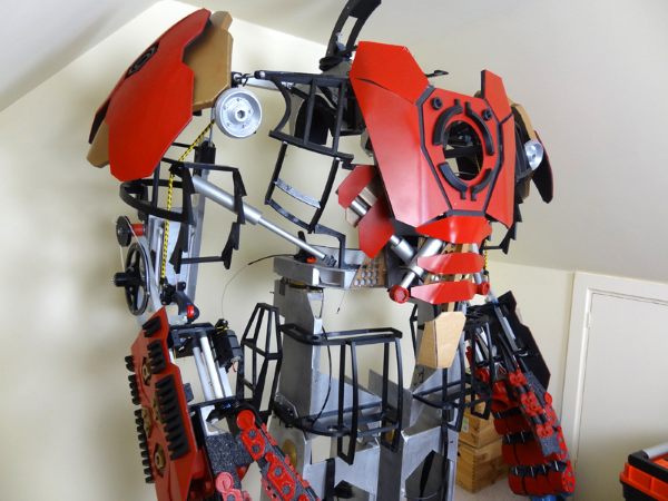 他的目標是構(gòu)建出一個能夠自主站立和支撐,使用大量3D打印的機械部件和電子器件組裝而成的機械戰(zhàn)甲。盡管其靈感來自鋼鐵俠,但大部分還是出自他自己的設(shè)計,整個外觀展現(xiàn)了大量很有機械感的細節(jié),整個套裝還能夠拆卸,以便于運輸。