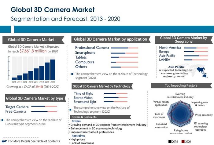 *在20142020年的預測期內,全球3D相機市場將隨著該技術在智能手機、平板電腦和其他設備上的應用不斷擴展呈現漸進性增長。