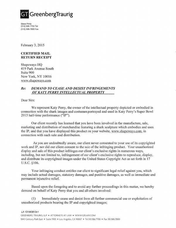 在3D打印領域,知識產權問題始終是一個揮之不去的影子。本周二,流行天后、水果姐凱蒂·佩里的律師向3D打印在線平臺Shapeways發(fā)出一封措辭嚴厲的信件,要求他們刪除剛剛在網絡上爆紅的鯊魚舞者Left Shark的3D模型。所謂Left Shark,是指超級碗中場Katy Perry在表演的時候,她左邊的鯊魚裝舞者的伴舞動作完全脫節(jié)的趣事,這一事件引起了好事網友們的瘋狂轉載。