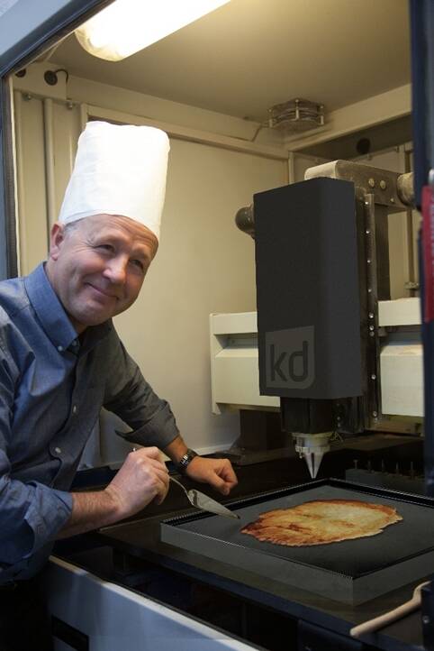 這款煎餅3D打印機采用了嵌入式人臉識別和跟蹤軟件來控制機器逐層把面糊攤到熱板上。然后就像傳統(tǒng)的煎餅?zāi)菢?,面糊攤上后立即開始烹調(diào),煎餅隨之改變顏色,并呈現(xiàn)出指定的圖案。