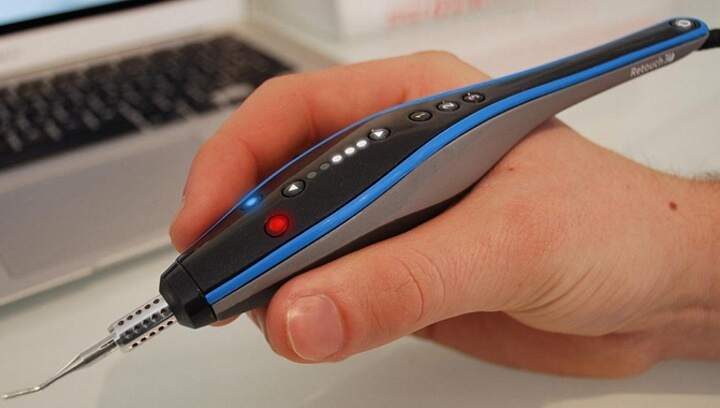 近日,Retouch3D已經(jīng)帶著這款產(chǎn)品在Kickstarter上發(fā)起了眾籌。坦率地說(shuō),3D打印領(lǐng)域里沒(méi)有其他人想出這個(gè)點(diǎn)子。該產(chǎn)品同樣也被稱為Retouch3D,是一個(gè)電加熱的工具,有點(diǎn)像我們常見(jiàn)的電烙鐵,它擁有5個(gè)可換頭,使用起來(lái)非常簡(jiǎn)單。由于工具頭上被加熱到高溫,這個(gè)工具去除支撐材料如同“切黃油”,您還可以用它對(duì)3D打印表面缺陷稍加修補(bǔ)。
